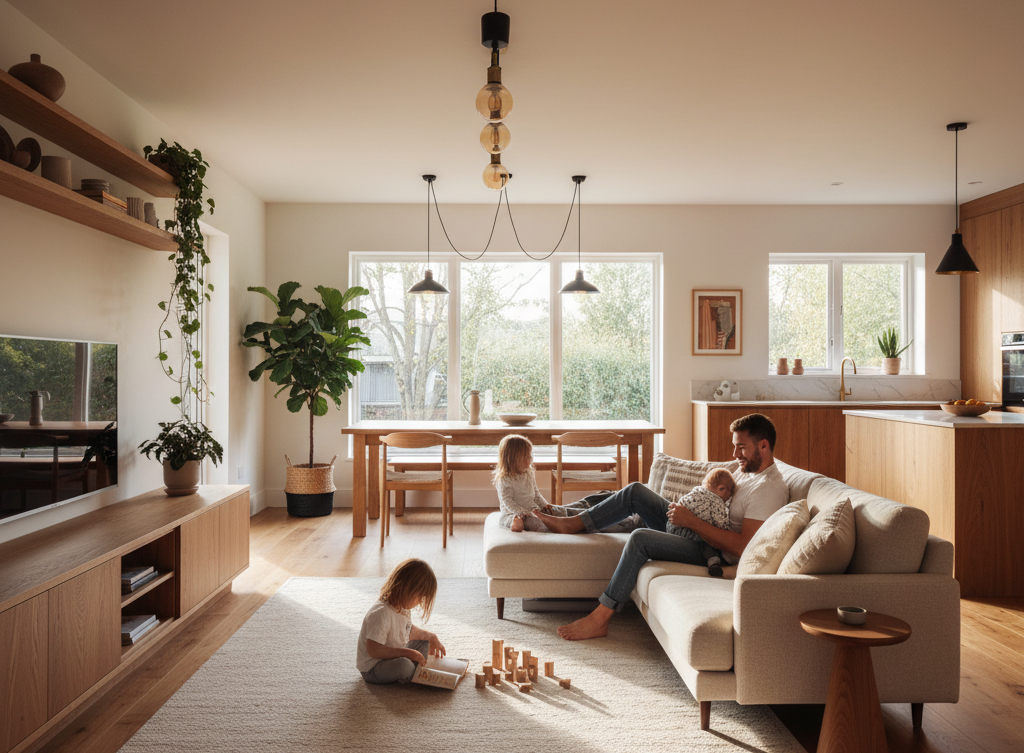 A once-dimmed 1970s bungalow transformed into a modern family retreat – natural oak, warm light, and quiet sophistication.